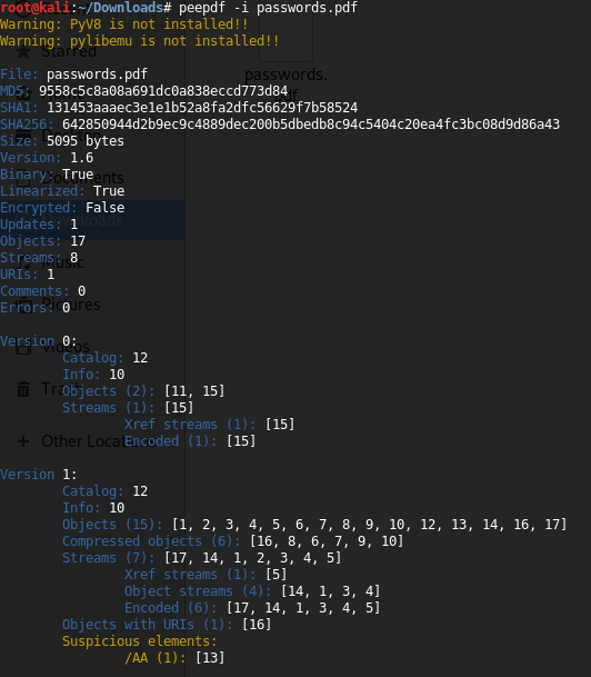 To start this task, we used a Kali Linux distribution. Next, we type the following command in the terminal: peedf -i passwords.pdf.