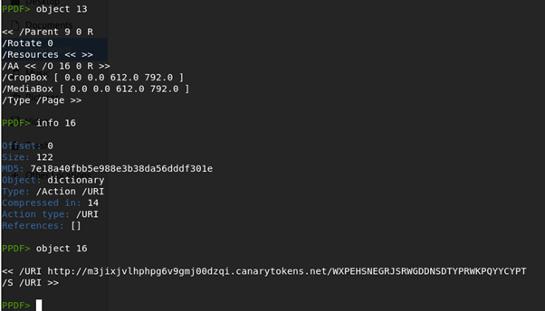 It’s possible, however, to detect if a particular PDF file has a canary token embedded in its metadata. To detect that, we can use the platform to generate a token and download the target PDF. We decided to fire up peepdf to analyze the internals.