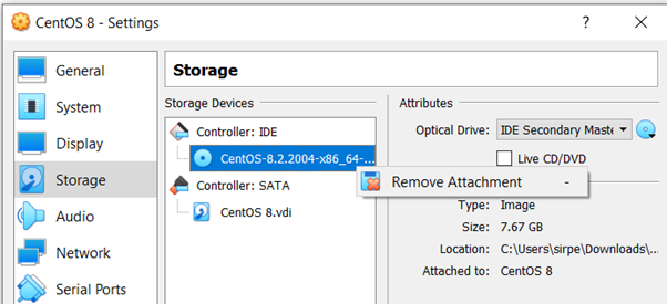 The ISO image of the downloaded CentOS has to be linked to the newly created virtual machine. Click on the setting - storage - empty and browse the ISO image.