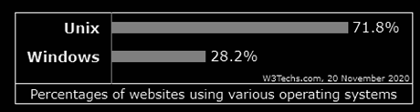 Unix-based operating systems are ruling the webserver OS market. According to data from W3techs, in 2017 Unix servers were used by 66.5% of all the websites, and 33.5% are using Windows OS. In the last few years, the market changed, but the Unix advantage is very clear: