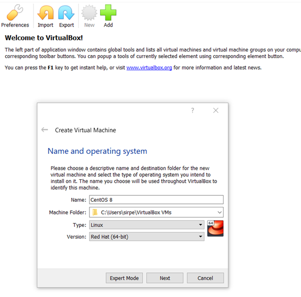 Install VirtualBox and open it. Click on the new to set up the new VM, select the Linux and then Red Hat, since CentOS is the clone of Red Hat and uses a similar architecture.