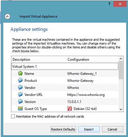 Click on File → Import appliance → Browse the WHONIX gateway → Next → Import → Accept