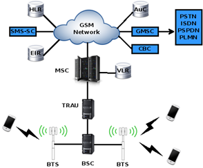 When MS communicates to a BTS, MS identifies himself using IMSI and IMEI, and BSC to MSC communication to respond to IMSI. The authentication function is to assure that MS is a legitimate user. An illustration can be seen in the image below: