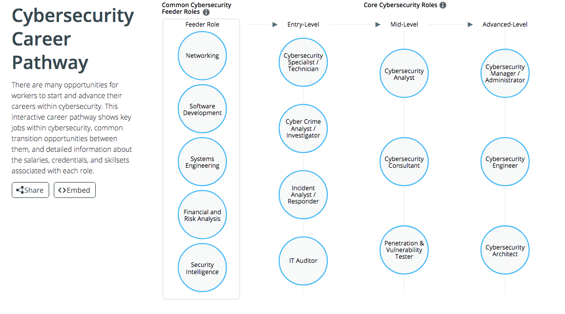 CyberSeek’s Cybersecurity Career Pathway tool takes all of the key pieces of information you need in order to make an informed decision about your cybersecurity career and presents it in a format that is well-organized, user-friendly, and highly interactive. Take a look!