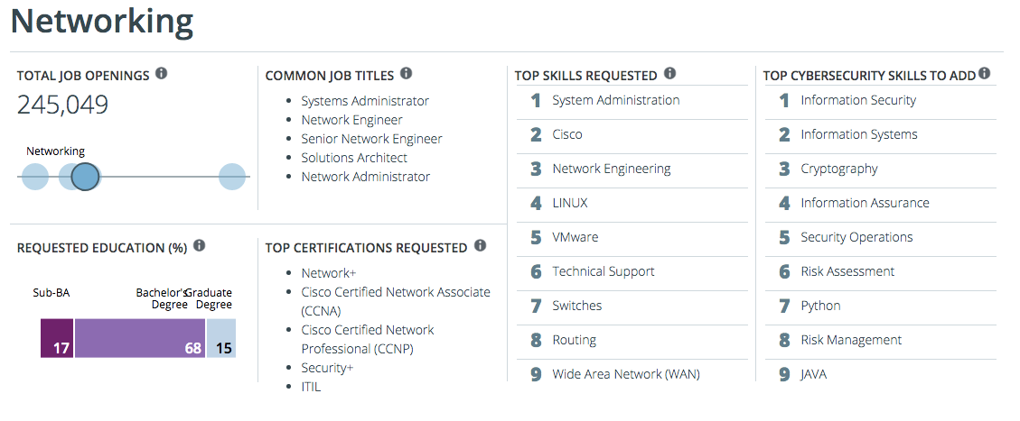 The information provided is designed to help you make informed decisions about your career. Information you can explore includes common job titles, degree requirements, top certifications and core skills. You’ll also find helpful statistics about salary and job openings.