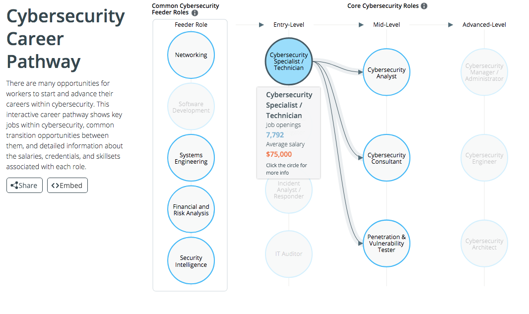 The hope is that tools like the CyberSeek Cybersecurity Career Pathway will help educate people who are interested in joining the cybersecurity field about what their career options are and what skills they need to enter the field.