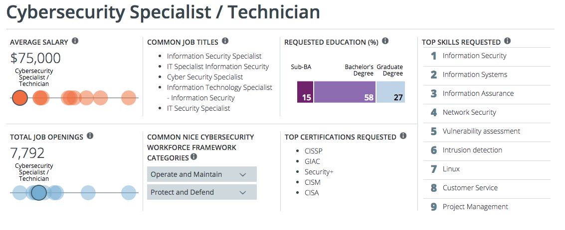 - Students: If you’re currently in college and just beginning to dip your toes into the cybersecurity field, CyberSeek can shed light on what your career options are and what you need in terms of skills and educational requirements to break into the field. Best of all, the platform includes lots of relevant data about current hiring trends so you can feel confident that you’re making an informed decision about your future. Features like Common Job Titles and Average Salary can help you narrow down your preferred cybersecurity career path