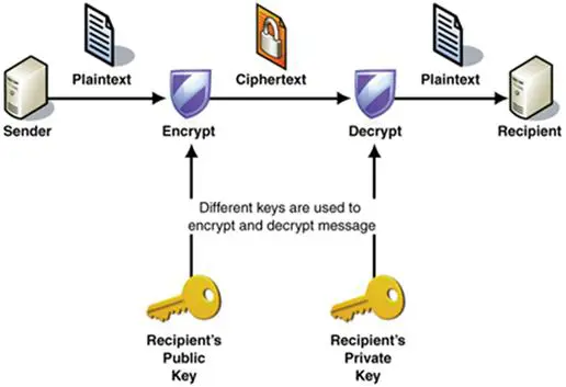 As shown in Figure 7-9, the sender uses the recipient's public key to convert plaintext to ciphertext. The ciphertext is sent and the recipient uses her private key to recover the plaintext. Only the person with the private key corresponding to the public key can decrypt the message, document, etc. This works because the two keys, although separate, are mathematically entwined.