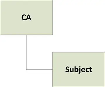 Root CAs can delegate signing authority to other entities. These entities are known as intermediate CAs. Intermediate CAs are trusted only if the signature on their public key certificate is from a root CA or can be traced directly back to a root. See Figure 7-14. In this example, the root CA issued CA1 a certificate. CA1 used the certificate's private key to sign certificates it issues, including the certificate issued to CA2. Likewise, CA2 used its private key to sign the certificate it issued to the subject. This can create a lengthy chain of trust.