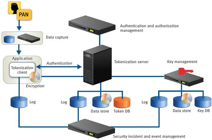 Figure 7-20 provides a closer look at tokenization architecture. Tokens and associated PANs are encrypted. Instead of PANs existing in business transaction files, only the token appears. If an application requires the actual PAN, employee authentication is not enough. The application must be authorized to retrieve it. Further, all access to PANs is logged and anomalies identified. Instead of tracking PAN use at various locations across an organization, monitoring and control of sensitive customer information is centrally controlled and managed.