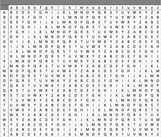 Vigenère's cipher is based on a Vigenère table, as shown in Figure 7-2. The table consists of 27 rows. The first row of lower case letters represents the plaintext characters. Each subsequent row represents a cipher alphabet. For each alphabet, the first character is shifted one position farther than the previous row. In the first column, each row is labeled with a letter of the alphabet. In some tables, the letters are replaced with numbers representing the corresponding letter's position in the standard alphabet. For example, "A" is replaced with "1," "C" with "3," etc.