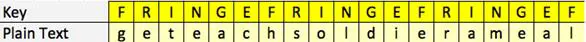 A key is required to begin the cipher process. For our example, the key is FRINGE. The message we wish to encrypt is "get each soldier a meal."