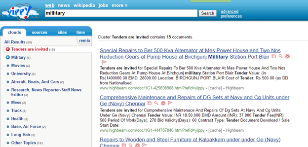 Yippy is formerly known as a cluster, and it is the best amongst the meta search tool available so far. It is unique because it employs its own clustering engine, software that organizes unstructured information into hierarchical folders. Clusty offers clustered results of Web, news, and certain specialty searches. The Clusty default is to search the web using Live Search, Gigablast, Ask, Wikipedia, and the Open Directory. Let see the logical categories that it creates: