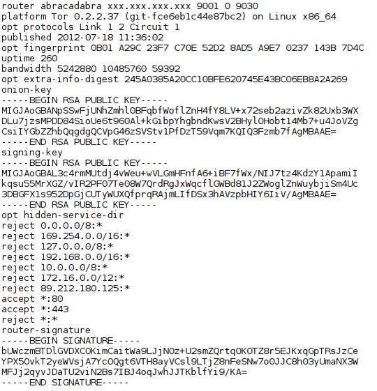 The picture contains a ton of information about our Tor relay, like nickname, external IP address and used port. This information is required if we want to run relay, otherwise how would clients know the IP address of the relay to connect to? It has to be seen on the normal Internet. The picture also reveals our public keys for onion-key and signing-key used for encrypting the data. It also shows the acceptable and rejected IP addresses as well as other information.