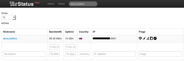 We searched for the search string "abracadabra", which is the nickname of our relay, so it is up and running. I've masked my external IP with xxx.xxx.xxx.xxx, but the address is there, so this is another confirmation that your relay isn't anonymous and its external IP is visible. The picture above also shows us what ports the relay will let through (80 and 443), the available bandwidth and the version of Tor running, plus some weird looking string "CwGinCP3xw5S0orVqecCNxQ7fUw", which I'm not sure what it means.