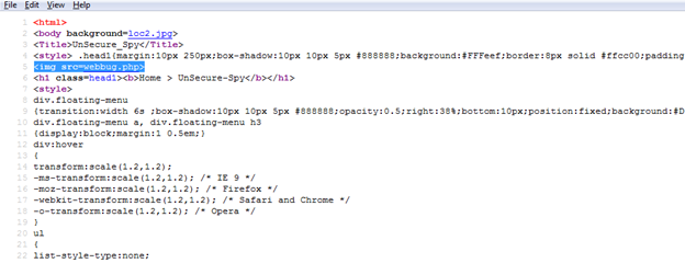 In order to find a web bug, you need to look at the HTML page source code of the given target webpage. For demonstration purposes, we'll look into the HTML source of a webpage: