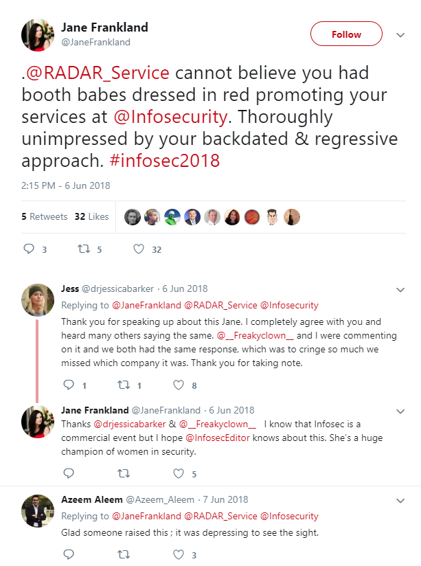 However, when I first became involved in cybersecurity back in the ‘90s, I was shocked at the lack of females anywhere. At Infosec Europe back in 1998, I felt like I was the only woman in the whole exhibition — apart from the “booth babes,” of course. 20 years later, things haven’t changed much. This Twitter discussion on the matter by cybersecurity consultant Jane Frankland shows that even now, women are presented at shows as a kind of prize for the male attendees: