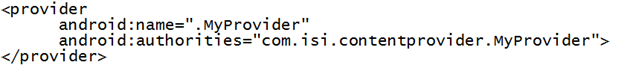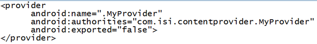 In the AndroidManifest.xml file of our application, we should add the following attribute to the content provider to be secured. In our case, com.isi.contentprovider.MyProvider is the content provider.