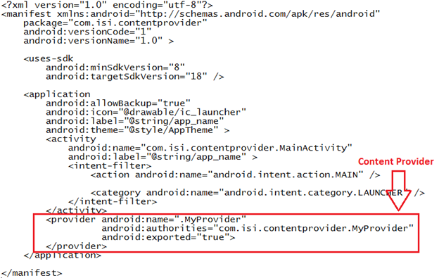 Content Providers are generally registered in the AndroidManifest.xml file in the following format.