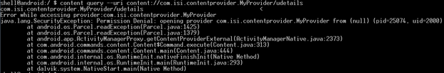 If we try to query the content provider whose android:exported value is set to false, it will throw an exception as shown below.