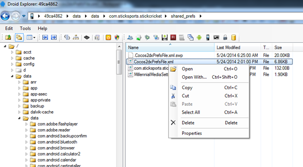 - Now, delete the Cocos2dxPrefsFile.xml file from the Android device using Droid Explorer.