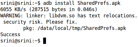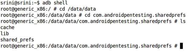 As we can see in the above figure, there is a folder named "shared_prefs". This gets created when an app is using shared preferences in it. We can change the directory to shared_prefs and use the "cat" command to look at the contents of this application right away.