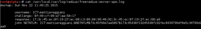 After a few minutes, if we have the better signal, the client will connect to our infrastructure, providing your credentials, encrypted with the MS-CHAPv2 protocol, form of challenge and response, which will be stored in the freeradius-server-wpe.log file.