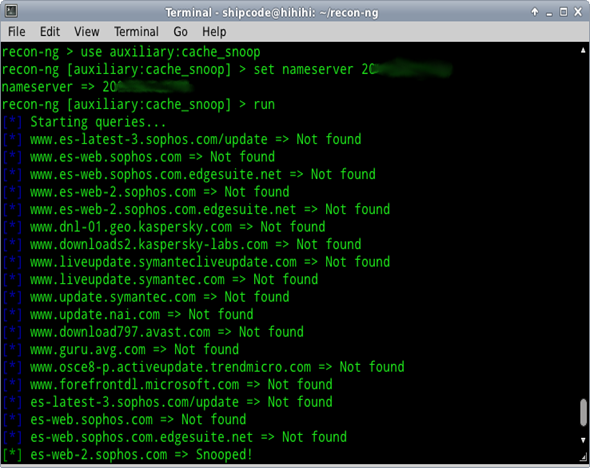 This auxiliary module is contributed by thrapt and is used for checking a name server's visited domains by using a technique called DNS cache snooping (Scraping). It makes non-recursive queries to the client's DNS servers with the use of known Antivirus update site domains so that we can check possible antivirus vendors that are used on a client's network. Below are the sites included in the Recon-ng Framework for the auxiliary:cache_snoop module which can be found under data/av_domains.lst: