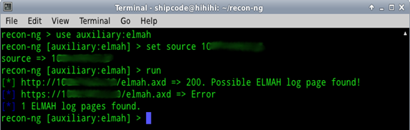 This module is one of the first auxiliary modules started by Tim Tomes a.k.a LaNMaSteR53, the main author of the Recon-ng Framework. This scanner checks for the 'elmah.axd' log page, an error logging module and handler that can be dynamically added to a running ASP.NET web application, or even to all ASP.NET web applications on a machine, without theneed for re-compilation or re-deployment. But there is a problem with this page –it can possibly be used by attackers for ASP.NET session hijacking because of the .ASPXAUTH cookie.