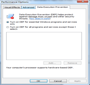 During the build, make sure that the non-executable system stack is implemented. Stacks are used to store function call arguments, return parameters, local variables but not executable code. So if we can implement a stack which is non-executable stack, a majority of buffer overflow attacks can be controlled. To implement this feature, windows even have a feature called "Data Execution Prevention" which is used to make stack non-executable. DEP settings are available at Systems >Advanced>Performance >Settings>DEP.