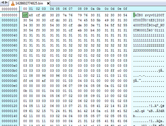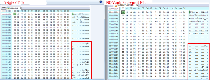The story is not over yet. It is also discovered that the app performs this worthless encryption only for the first 128 bits of the user's file, and stores the rest in plain format. So it's all out there in the raw for the attacker to see. For example, in the above example, notice that only the first 128 bits are XOR-ed, and rest of the bits remain the same. The below screenshot gives a clear idea: