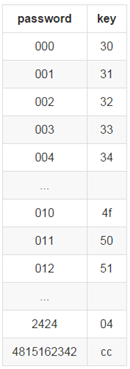 - What this suggests is, based on the passcode selected by the user, it generates a "key" (30 in this case) and just XORs the user's file with this key! Upon investigation, it turned out that this key value is always between 00 and ff, which means 255 possible values. As explained by NinjaDoge24, here are some of the passcodes and their corresponding key values: