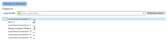Now on the main screen of Wireshark, it will show a list of possible adapters to capture from. In this example, I’ll be using WiFi 2 as it has traffic flowing over it (shown by the black line).