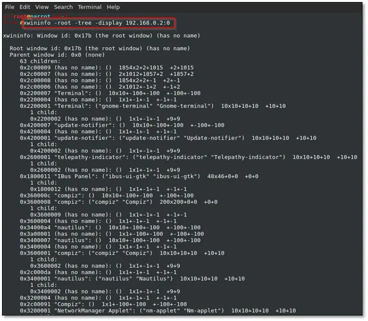 Exploitation: Here we will be using multiple tools. The first one is the xwininfo. xwininfo utility which allows for displaying information about Windows. This includes details such as window IDs or geometry. Type the following command to see the target details: