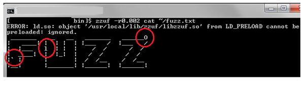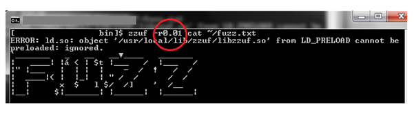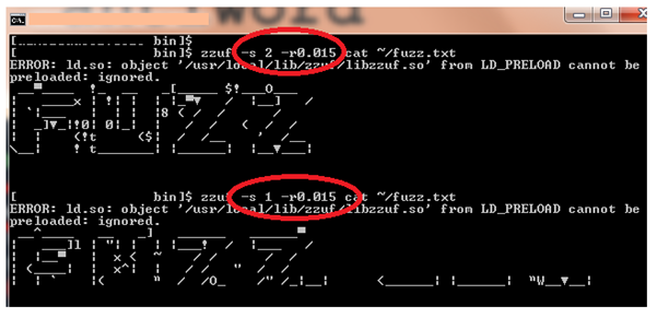 Screen 2: With zzuf, we can change the amount of bits we want to fuzz and can specify it with –r flag. As shown, 0.002 means fuzz 0.2% of the bits and 0.01 means fuzz 1% of the bits.