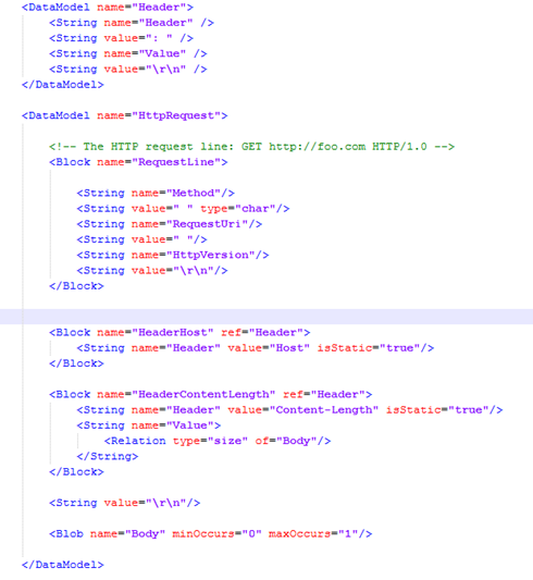 Complex protocols are split into parts: each part with its own data model for reuse. A data model can then further be split into Blocks. Also, if a reference (ref attribute) is supplied, the contents of the reference are copied to create the base of the new data model. Any child elements in the data model will override elements that already exist with the same name.