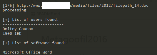 The current source of Metagoofil may no longer work. However, we are including a link to a modified version that should function correctly. Be aware that some servers may disallow Metagoofil access to the files extracted by Metagoofil which will lead to an error for that particular file.