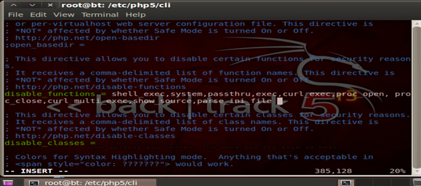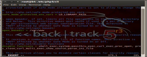 In most web server setups it's strictly advised that the web applications are not allowed to read files outside of the web root directory. All the web server files are generally located under /var/www unless a customization is done. Hence we restrict the PHP applications to act outside this directory by using the open_basedir as shown below: