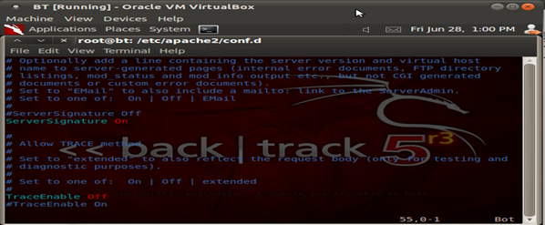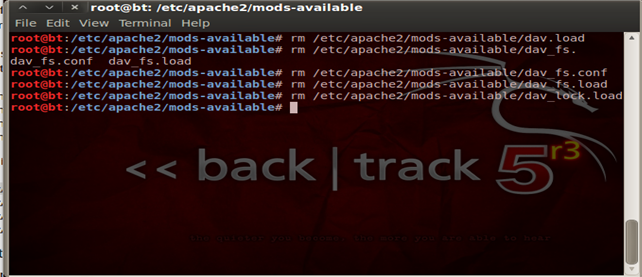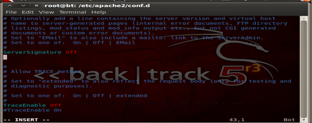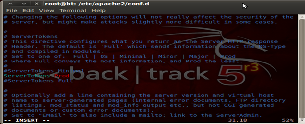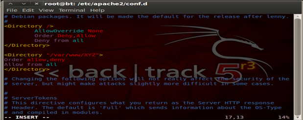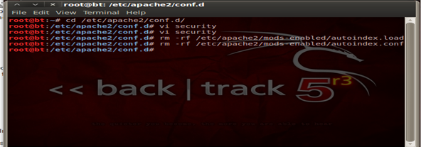 Always remember it's the best security to deny all and only allow specific services, ports and firewall rules as per the configuration. So the same goes for Apache as well, we follow a whitelisting technique to deny all and only allow what is required. Hence what we have done here is to block access to all the directories. These configurations and changes have to be done in the main configuration file of Apache, or if you are using a newer version of Ubuntu/ Backtrack r3 they can be found under/etc/apache2/conf.d/security