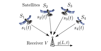 A the GPS receiver installed on the UAVs works exactly as any other GPS devices, observing the signals from a set of satellites and using the relative delays of the signals [si(t)] to solve the equations which determine the position of the vehicle and the time offset Δ of the receiver V.