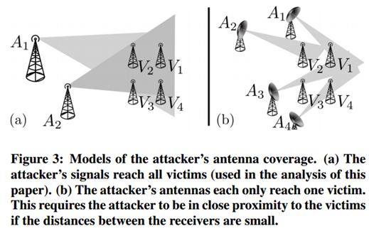 During the attack, the GPS signals can be spoofed by a hacker that could gain complete control of wireless traffic by intercepting, injecting, modifying, replaying, delaying, and blocking messages without temporal constraints for individual receivers. As explained in the paper "On the Requirements for Successful GPS Spoofing Attacks", "If the attacker has full control over the input to each individual receiver antenna, he can send the signals as they would be received at any location L0 j. This would, however, require the attacker to either be very close to each receiver or to use directional antennas with narrow beam widths and shielding to prevent that the signals intended for one victim are also received by another victim; in both cases, the number of required attacker antennas would be linear in the number of victims."