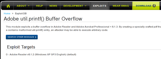 The old version of PDF Reader can be found on various web pages, but most prominent web page is definitely oldapps. We need to search for a specific version of Adobe PDF Reader, which was vulnerable to the util.printf() buffer overflow vulnerability. But which version do we need? Luckily the exploit for the util.printf() buffer overflow vulnerability can be found in the Metasploit modules as we can see oin the picture below:
