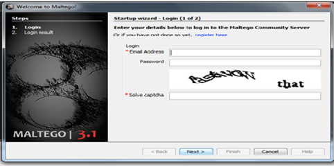 Download Maltego from paterva.com and register yourself at Maltego community server. After its setup, launch it and enter the mail address and password to log in to the Maltego community server.