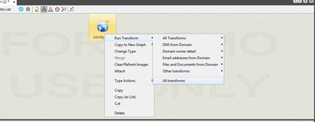 Right click on the domain name and then select "All Transform". By choosing this option you will get all the information weather it's an email ID, DNS related to Domain, Domain owner details, file and documents from details, telephone numbers, etc. Wait for a few moments to complete the transform and you will get the desired result.