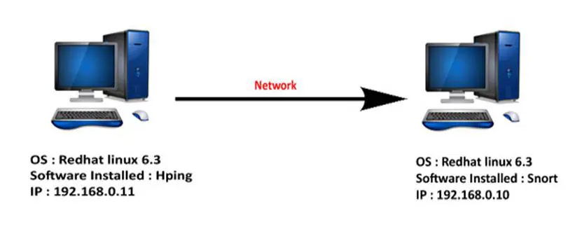 Firstly install Hping on the source machine. It's a command line multi-platform software. We are using two Linux machines for the test. The installation package could be downloaded from various websites. The next step is to install the intrusion detection software at the destination end. Download the latest version Snort with Winpcap and install it on the machine. Winpcap is a driver that helps in collecting packets. After setting up two machines, establish a connection between the two machines to transfer the packets. Check the connection before sending the packets.