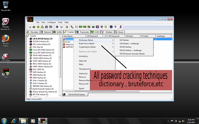 Now it's time to speak about the cracker tab,the most important feature of Cain.When Cain captures some LM and NTLM hashes or any kind of passwords for any supported protocols, Cain sends them automatically to the Cracker tab.We will import a local SAM file just for demonstration purposes to illustrate this point.Here is how to import the SAM file: