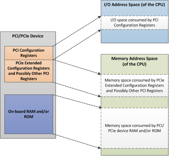 Figure 2 shows a simplified mapping of PCI/PCIe device registers and memory into the CPU I/O address space and memory address space respectively. Remember, Figure 2 is a simplified version of the real-world device registers and memory mapping. In practice, you might find the mapping to be more complicated than that. Read the PCI/PCIe device datasheet, along with other related datasheets such as the CPU and chipset(s), to find out the exact mapping.