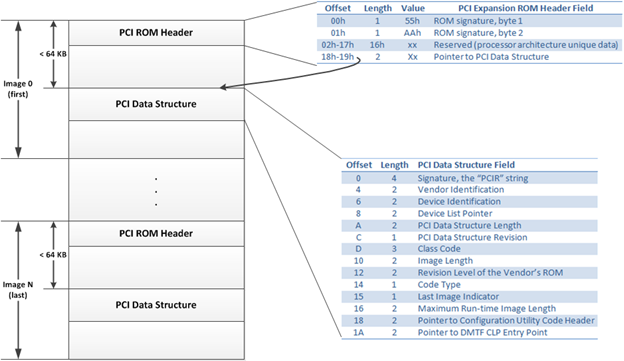 PCI Firmware Specification has a specific rule for the format of the processor architecture unique data for x86/x64 architecture. Table 2 shows the PCI expansion ROM header format.