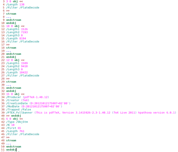 There’s quite a lot of the necessary elements to create such a simple PDF document, so we can imagine how a really complicated PDF document would look. We also need to remember that all the encoded data streams were removed and replaced with three dots for clarity and brevity.