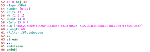 After that, there is the /Root element that specifies the catalog directory for the PDF document to be object number 14. The /Info is the PDF document’s information directory that is contained in object number 15. The /ID array is required because the Encrypt entry is present and contains two strings that constitute a file identifier. Those two strings are used as input to the encryption algorithm.